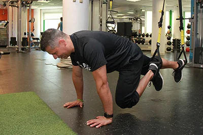 - Start in plank position with your palms on the ground and feet in the TRX straps.