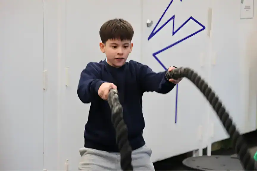 After just a few sessions, Battle Ropes quickly became one of Lucas’s favorite exercises. Requiring both sides of the body to work together synchronously, Battle Ropes help Lucas organize his attention and energy while improving his coordination. This movement also targets the arms, shoulders, back, and core in one, offering a perfect warm-up for the rest of the session. After his first season in the program, Lucas is confident enough to do the battle ropes with his peers, matching their rhythm and sharing a smile.