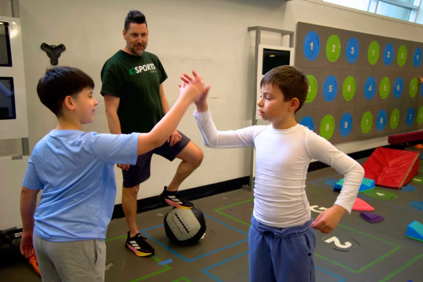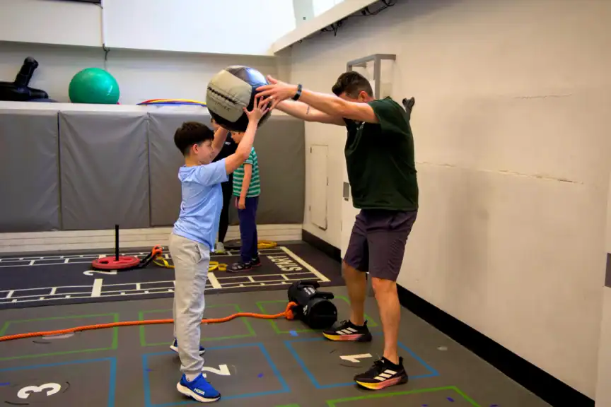 Building on Lucas’s excitement, we transitioned quickly to the Med Ball Slam. Leveraging his strength in a controlled, purposeful way, this exercise grounds Lucas as he lifts the ball overhead, pauses, and slams it down powerfully. After completing the rep, Lucas waits patiently for his classmate to complete his turn and cheers him on.