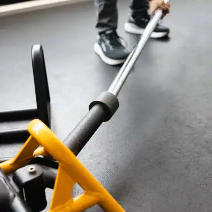 The landmine single-leg deadlift allows you to perform this essential leg movement with added control. Start by standing tall and holding the bar with one or both hands. Shift your weight onto one leg and hinge forward at the hips, allowing the bar to travel downward as your free leg extends behind you. Keep your back flat and core engaged as you lower, then drive through the standing leg to return to an upright position. Move slowly to maintain balance and control.