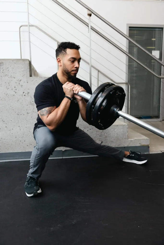 The landmine Cossack Squat is perfect for experienced athletes seeking a greater challenge in the gym. This exercise trains mobility, balance, and leg strength in a single movement. Begin by standing perpendicular to the bar with a wide stance, holding the bar with both hands in a goblet squat position at chest height. Shift your weight to one side and sink into a deep squat on your corresponding leg while keeping the opposite leg extended straight. Push through the bent leg to return to standing before switching sides.