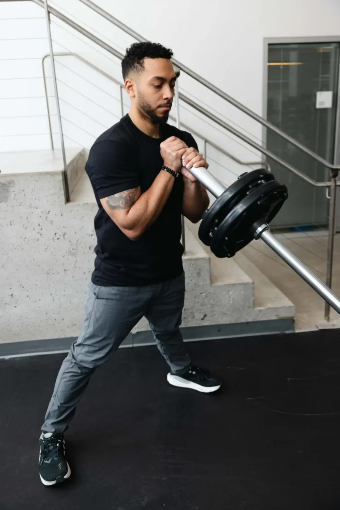 The reverse lunge combines lower and upper-body training for the perfect finish to your landmine workout. Hold the landmine bar at chest height and step one foot back into a reverse lunge, lowering until your front leg forms a strong base. As you step forward to stand, press the bar forward and upward in a controlled motion. Finally, bring the bar back to chest height before switching legs.