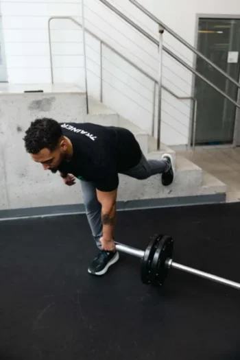 The landmine single-leg deadlift allows you to perform this essential leg movement with added control. Start by standing tall and holding the bar with one or both hands. Shift your weight onto one leg and hinge forward at the hips, allowing the bar to travel downward as your free leg extends behind you. Keep your back flat and core engaged as you lower, then drive through the standing leg to return to an upright position. Move slowly to maintain balance and control.