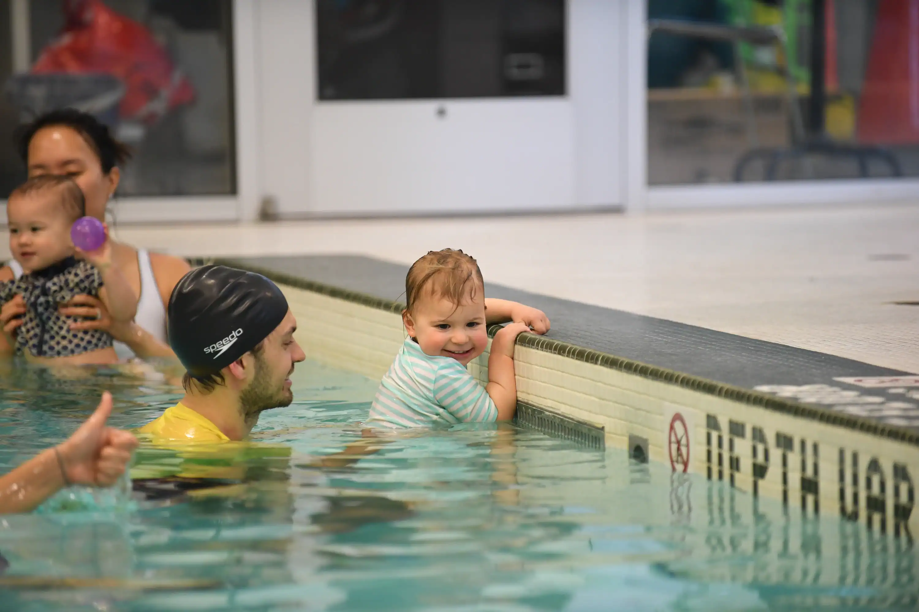 One parent or guardian must accompany their child in the water for the duration of class. You do not need to know how to swim — our pool is kept at a shallow depth of between 3 and 4 feet.